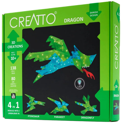 With 138 Creatto pieces and a string of 80 LED lights, you can build a dragon, pterosaur, bird, and dragonfly. Lights powered by USB cable; USB power adapter not included. Suitable for ages 8 and up.