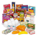 • Includes: Shopping cart, 15 food boxes, water bottle, milk bottle, pear juice can, soup can, loaf of bread, chicken, 6 eggs, egg carton, and a banana (specific food items may vary).