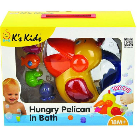 Provide cause-and-effect concept learning for babies. Great for training baby's fine motor skill through repetition. Our Pelican is getting hungry again! Need baby's help to get seafood in the tub. Press the handle to have Pelican clicked his wings, opened his mouth to taste the yummy seafood. Water and seafood all come down to his big tummy.