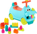 The Hippo Ride-On & Building Blocks playset from B. toys comes with sounds, lights, blocks, and tons of ride-on fun! Sunny the hippo features a comfy seat, an easy-to-hold handle, light-up eyes, silly sounds, wheels that roll smoothly across flat surfaces, and secret storage space that fits all 26 building blocks. Toddlers can ride away all day and make pit stops to build and play! The chunky blocks are colorful, tiny hands-friendly, and they encourage a whole lot of open-ended play. Little ones can build fun structures, decorate Sunny with some blocks, or open this hippo’s mouth to store the blocks inside. This versatile set keeps kids active, develops motor skills, and sparks creativity. 3 AAA batteries are required and included. Recommended for toddlers 12 months and over.