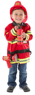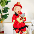 Sound the sirens and make way for the rescue! This role play outfit has everything an aspiring firefighter needs in an emergency: a bright red jacket trimmed with reflective material, a fire chief helmet, a "fire extinguisher," a bullhorn with sound effects, a shiny badge, and a name tag so kids can personalize their outfit. The Fire Chief Role Play Set is sized to fit boys and girls ages three to six. The high-quality fabrics and solid construction ensure durability so your kids can wear it over and over again. The jacket can be machine washed, and it comes with accessories that can easily be wiped clean. With authentic firefighter details, these role-play accessories encourage exciting pretend play for little heroes! The costume set helps promote narrative thinking and creative expression, along with independent and cooperative play. It makes a great gift for kids ages three to six for hands-on, screen-free play.