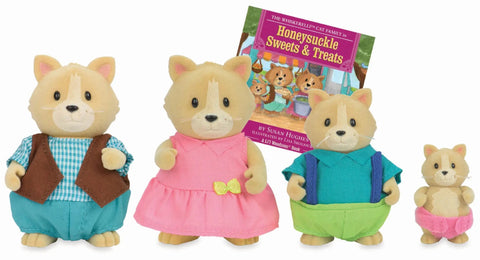 Say hello to the Whiskerelli Cat Family! These animal characters live in Honeysuckle Hollow, a friendly neighborhood where all the Li’l Woodzeez work together and have fun. This toy set comes with four cat characters: Mom Kitt, Dad Chet, and kids Wally and Dixie. Also included is a family storybook, “Honeysuckle Sweets & Treats”, so you can learn more about the adventures of the Whiskerelli Cats! These tiny toys are soft to touch, and you can move their heads, arms, and legs for hours of pretend play. Each miniature figurine comes with a colorful outfit, which you can mix and match with other Li’l Woodzeez toys. Use your imagination to explore the wholesome world of Honeysuckle Hollow!