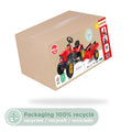 Red Supercharger pedal tractor equipped with steering wheel, horn and large-capacity trailer – 100% made in France for garden adventurers from 3 to 7 years old.