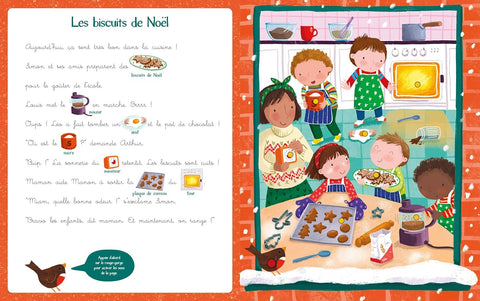 Les enfants préparent des biscuits pour le goûter de l'école ; au marché de Noël, un musicien joue de l'orgue de Barbarie ; le Père Noël rend visite à ses amis de la forêt... Dans ce livre, les jeunes enfants trouveront sept histoires à lire à deux voix pour s'initier au plaisir de la lecture. Les illustrations incrustées dans le texte invitent à chercher les mots et les boutons sonores donnent vie aux histoires.