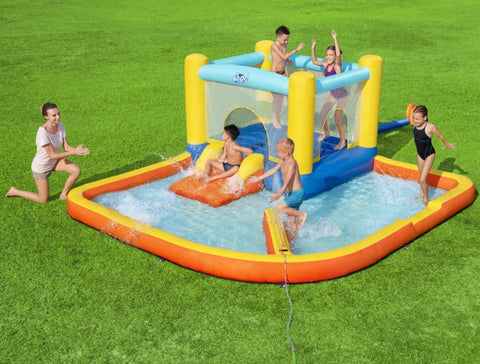 Bring bouncy fun right to your own backyard with the H2OGO!® Beach Bounce Inflatable Water Park! This fun park will be the talk of the entire neighborhood, especially since it inflates in less than 2 minutes using the included blower. The giant bouncer with mesh safety walls is perfect for energy-filled kids to jump and play in the great outdoors. Featuring a slide that leads into the giant splash pool, and a sprinkler that creates a wall of water for kids to run and jump through, your little ones will have so much fun that they’ll beg to go outside and play everyday! Double-stitched for increased durability, the H2OGO! Beach Bounce Inflatable Water Park is perfect for parties, get-togethers and hot summer days year after year!