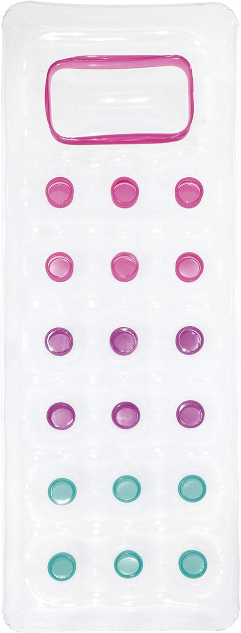 Enjoy the pool or the beach with the chic and elegant Fashion lounge chair. Stay on the cutting edge of fashion this summer with this lounge chair that will attract all eyes. Inflation will no longer be a problem thanks to the two air chambers that will simplify your life. The comfortable integrated cushion is perfect for napping and its transparency will allow you to see through. This durable lounge chair is made of sturdy vinyl. The colorful honeycomb construction of the mattress is visible from the outside. The mattress is delivered with a patch to repair any puncture.