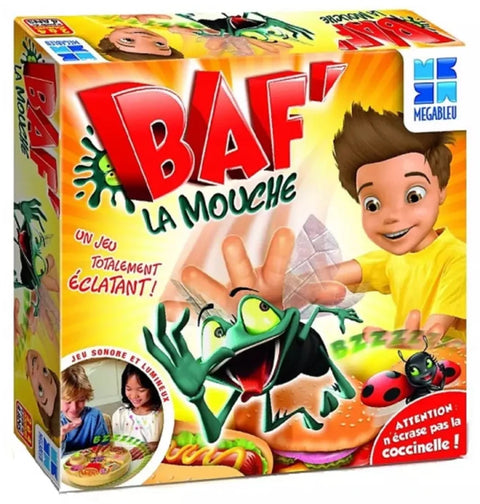 Dans Baf’ la mouche de Megableu, attrape vite la mouche, mais pas la coccinelle ! Sur ton plateau-repas à décorer virevoltent des insectes symbolisés par des LED qui s’allument tour à tour : en rouge les agaçantes mouches à éliminer avec lesquelles tu marques des points et en vert les coccinelles qui t’en retirent… A toi d’avoir les bons réflexes pour n’écraser que les mouches et marquer le premier les 9 points qui feront de toi le grand gagnant !