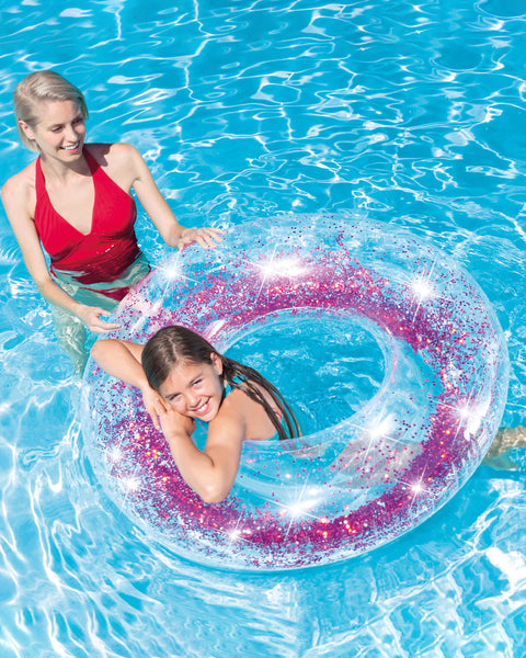 Catches everyone's attention and look gorgeous in your next pool party with the Intex Transparent Glitter Tubes. Measures 47in in diameter, these tubes are filled with gold or pink glitters that move around within the tubes. The sun hits the glitters and sparkle all the colors in the rainbow. They are the perfect tubes that everyone want to play with!