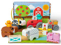 • Farm Play Set includes 21 wooden blocks, 2 play figures, 22 connectors, felt horns and chicken wings with built-in connectors, trailer hitch, windshield, 6 wheels, large tractor wheels, and illustrated play guide for putting together a tractor and trailer, cow, sheep, pig, horse, chicken, food, and hay bale