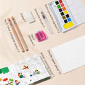 The kit includes-24 Coloring Pencils, 18 Oil Pastels, 14 Washable Markers, 16 Rotary Crayons, Gouache kit with 12 Pigments, 2 - 2B Pencils, 1 Sharpner, 1 Eraser, 1 Coloring, Book, 10 Doodle Sheets.