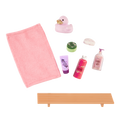 - Detailed Accessories: Includes a doll bathtub, bath tray, towel, bath ducky, bar of soap, bottle of shampoo, bubble bath, hair mask, and a tube of exfoliant.