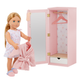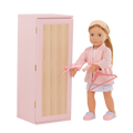 Store your 18-inch doll clothes and accessories in style with the Our Generation Fashion Closet! Made of wood, this modern wardrobe has an opening door that reveals a floral-print wallpaper and interior rod to organize tops, dresses, and jackets on the 3 clothes hangers. And when it's time for dress-up, the full-length mirror behind the door lets your dolls pick out the perfect outfit for their daily adventures! The closet also features a pullout drawer to store accessories like purses, hats, or folded outfits, with a convenient platform to display your doll's footwear - even cozy slippers! Included accessories like the eye mask, slippers, bathrobe, and nightgown start their clothing collection. The fashion closet arrives fully assembled, measures approximately 19" (H) x 7" (W) x 7.5" (L), and is the perfect addition to your doll's furniture sets. (Dolls sold separately)