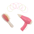 - Includes: A pink and gold salon chair, a metal bristle brush, a hair dryer with a fun sound, and 6 hair elastics.