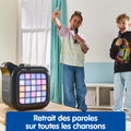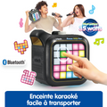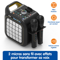 Elle intègre 2 micros sans fil, plus de 15 chansons et mélodies intégrées, de 6 effets vocaux, un mode Bluetooth®, des lumières animées et même un espace créatif Pixel Art lumineux. Le tout dans un design robuste avec poignée de transport intégrée.