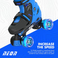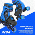 Where versatility meets style and excitement! Our Combo Skates are the ultimate blend of style, safety, and pure fun! Say goodbye to cramped toes and hello to skating adventures that fit just right! With adjustable sizing available in two cool ranges (30-33 and 35-36 EU size), finding your perfect fit is as easy as pressing a button. As safety comes first with our skates, we designed them with a triple protection system to keep you rolling with confidence. From sturdy velcro straps to high-strength buckles and secure laces, we've got you covered. Plus, in the Inline mode, our Combo Skates feature a convenient heel brake, while in Quad mode, you'll find a toe stop for added control. As you know, the fun doesn't stop there. Enjoy the Neon automatic lighting system and get ready to glow as you go and add a pop of colour to every roll. No batteries are required.